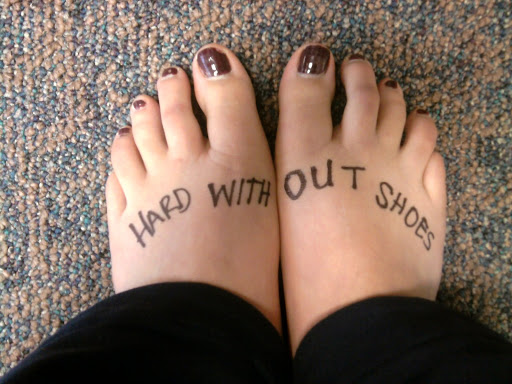 While I was at the office trending #hardwithoutshoes on Twitter, I saw a picture of a girl with “hard without shoes” written on the bottom of her feet and felt inspired to write it on the top of mine. I just wish I would have thought to do this before I went trekking through places of public interaction. Oh well.