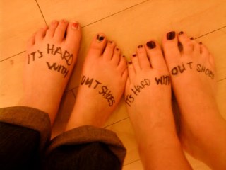 After rehearsal Lana and I went back to the mall (this time with our feet proudly proclaiming “It’s hard without shoes”) and I returned the shirt I bought today. We also perused several stores and finally someone asked us “what is up with the barefeet?”! I was so excited that someone finally asked instead of just staring and keeping their curiousity pent up like biscuits waiting to explode from the tube. I was also thrilled to tell her about the cause.