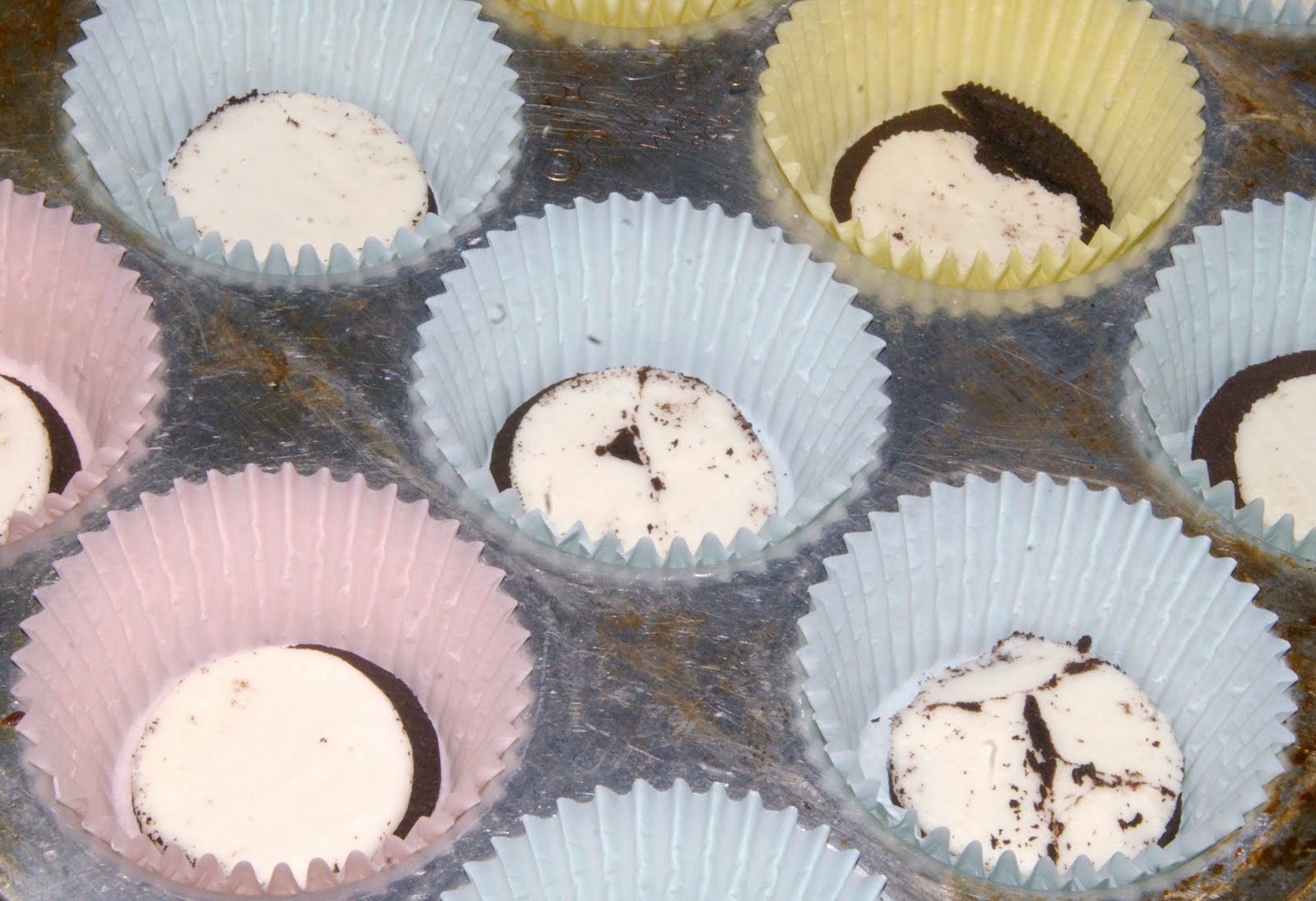 Start out with cupcake liners and put half of a Double-Stuf Oreo in the bottom.