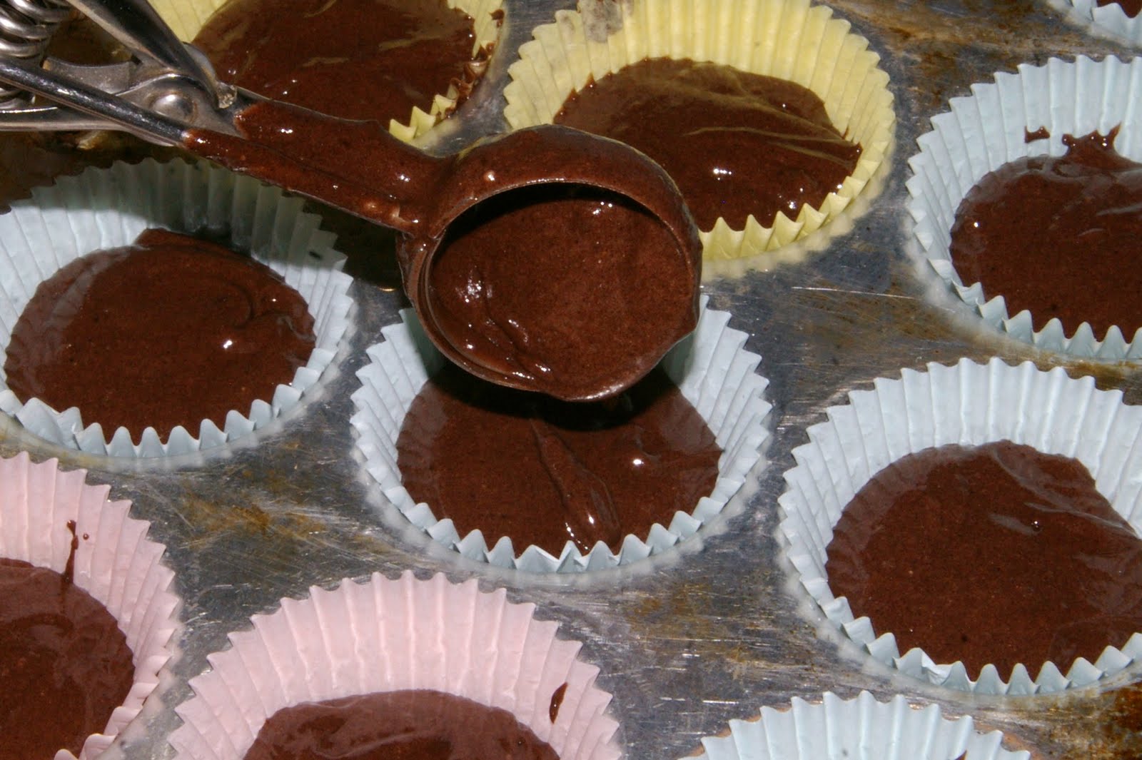 Then mix a box of cake mix (I used dark chocolate fudge) according to directions and spoon into liners.