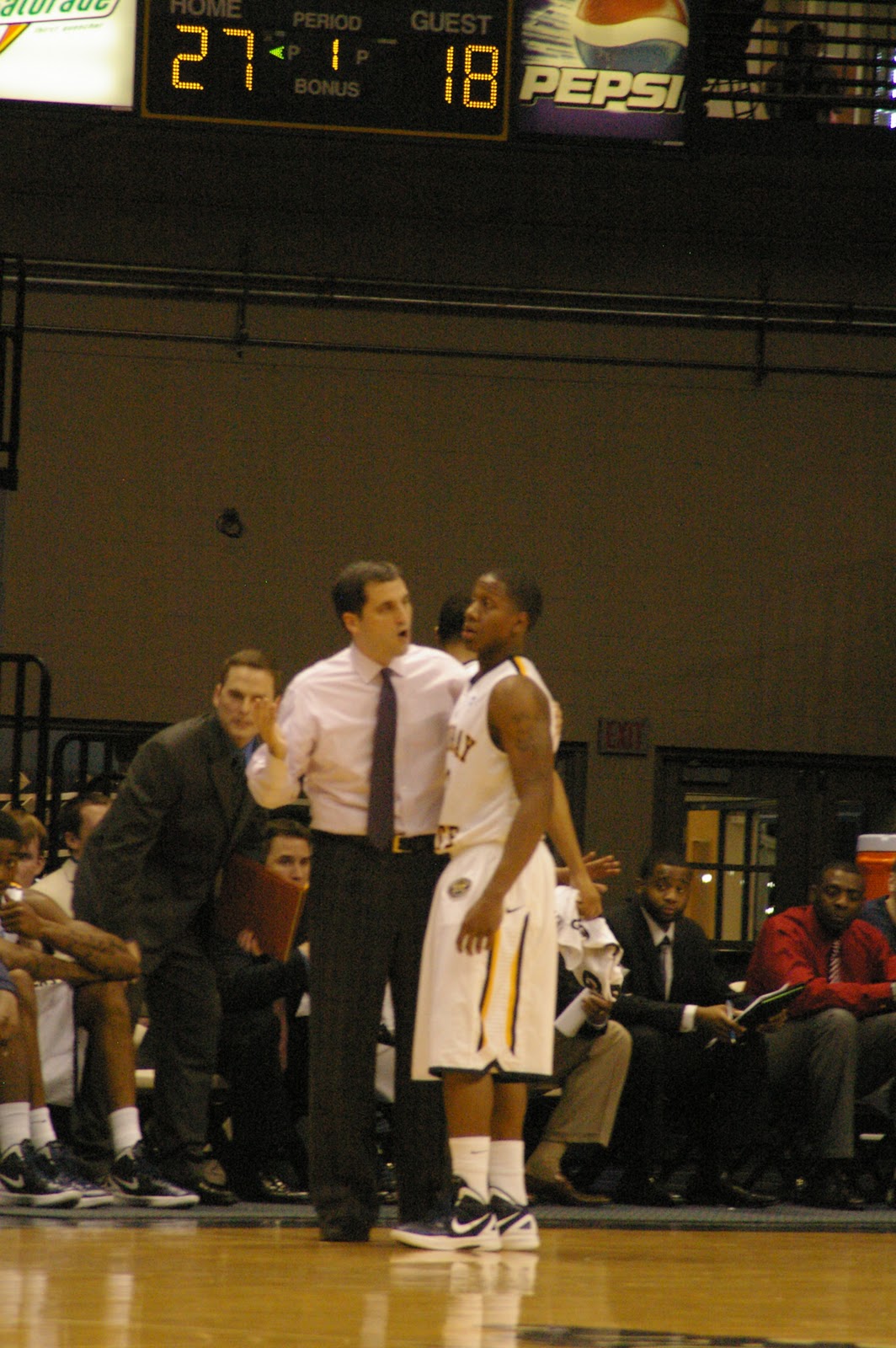 | Steve Prohm speaks with Isaiah Canaan during the Lipscomb victory. Photo by Sophie McDonald/The News |