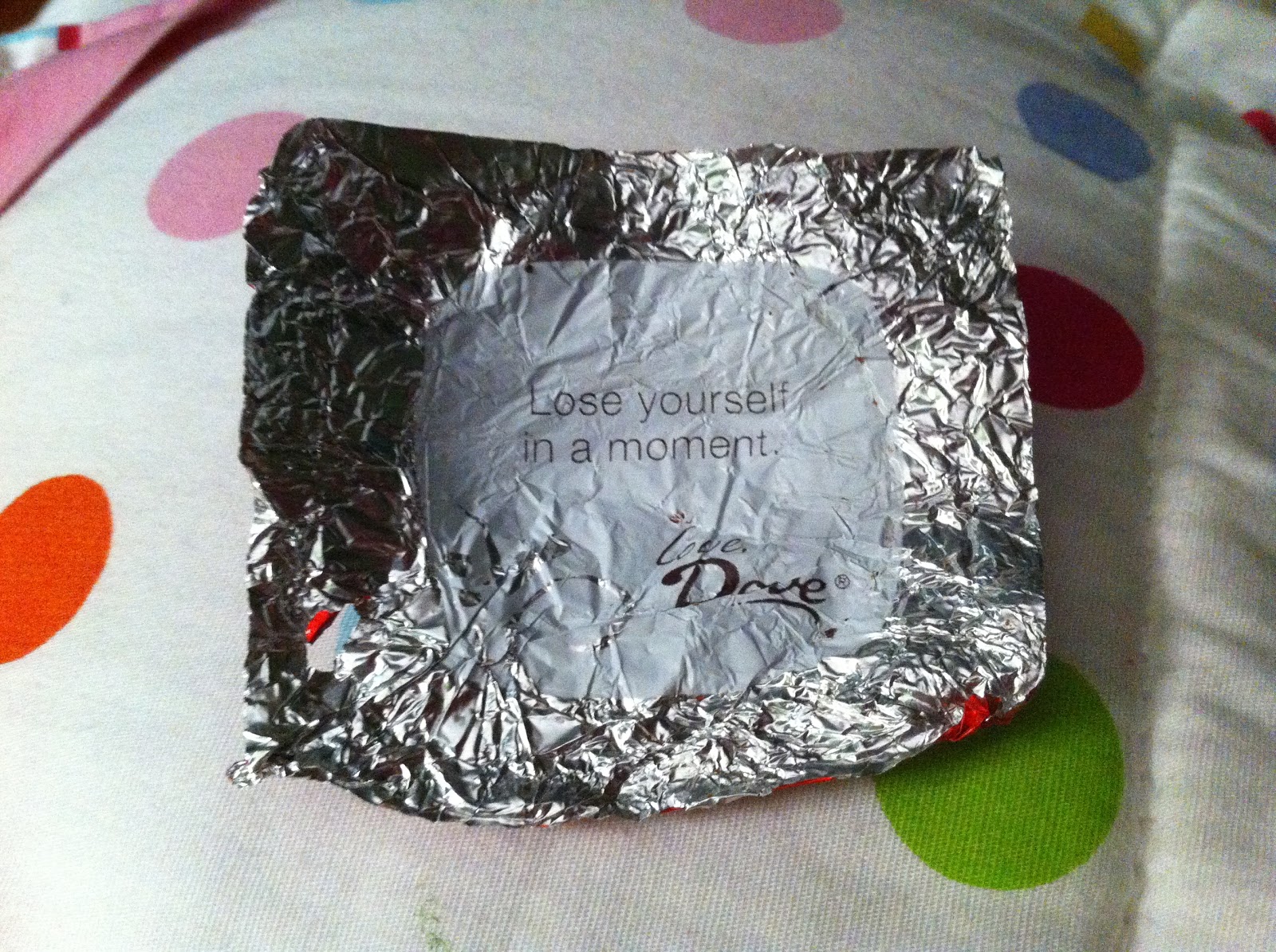 As I read that I was struck by the inconsistencies of the human race. People go to far away colleges and on world-wide voyages to escape current situations so we can “find ourselves,” but then when we get there what happens? Dove chocolate tells us to lose ourselves in a moment.