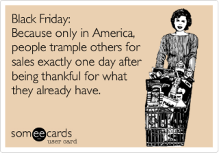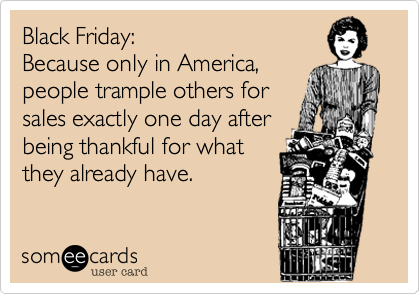 People spend days thinking about and planning a day of feasting with their family and then the next thing you know it’s 3 a.m. Friday and they’re standing in a line outside (insert store name here) waiting to get that awesome deal on a 52″ television or sleek computer or that one toy the child can’t live without.