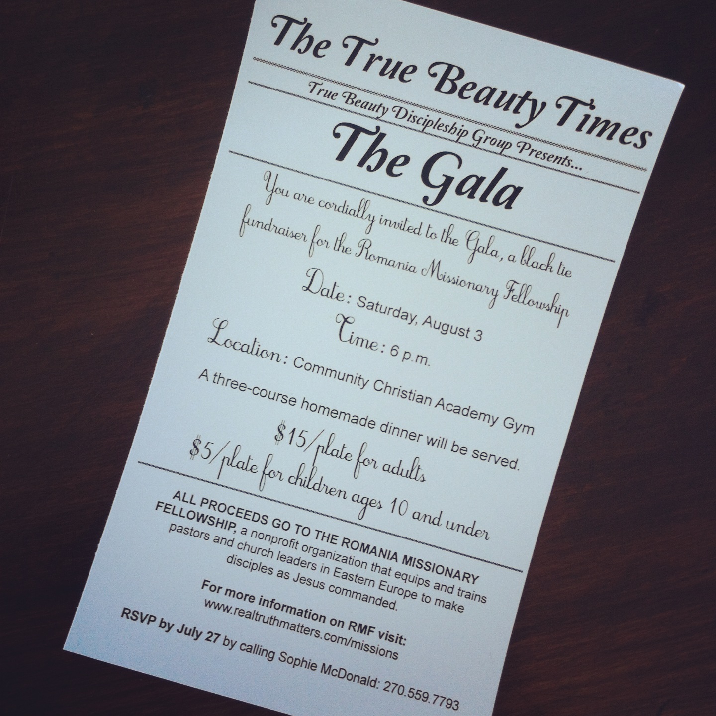 On Saturday night, August 3rd, my True Beauty discipleship group from Oak Grove Baptist Church in Paducah, Ky., will be hosting a Gala fundraiser at the Community Christian Academy gym with ALL proceeds going toward the Romania Missionary Fellowship – a missions initiative to train pastors to make disciples and plant churches in parts of Eastern Europe where there is no evangelical presence.