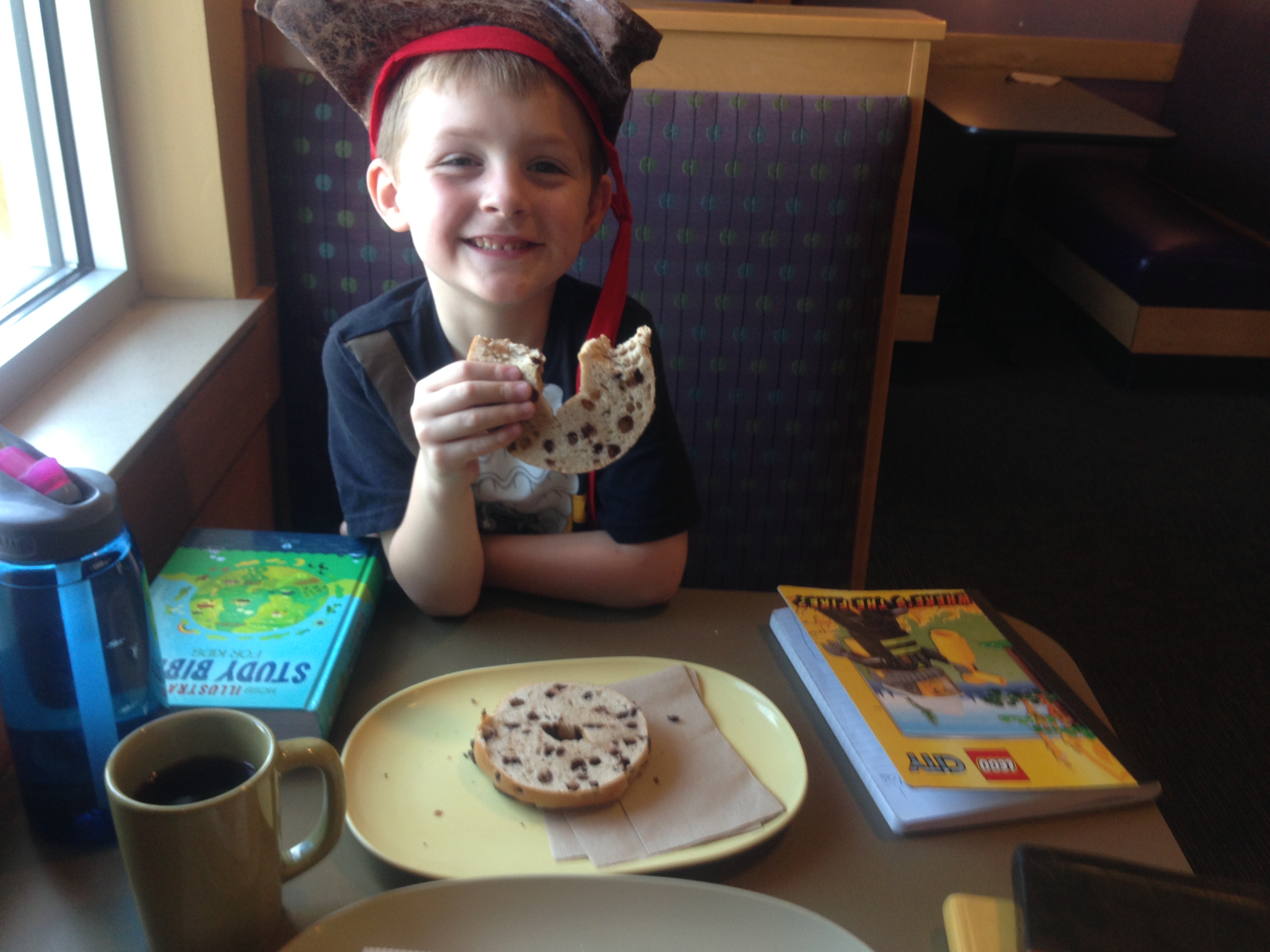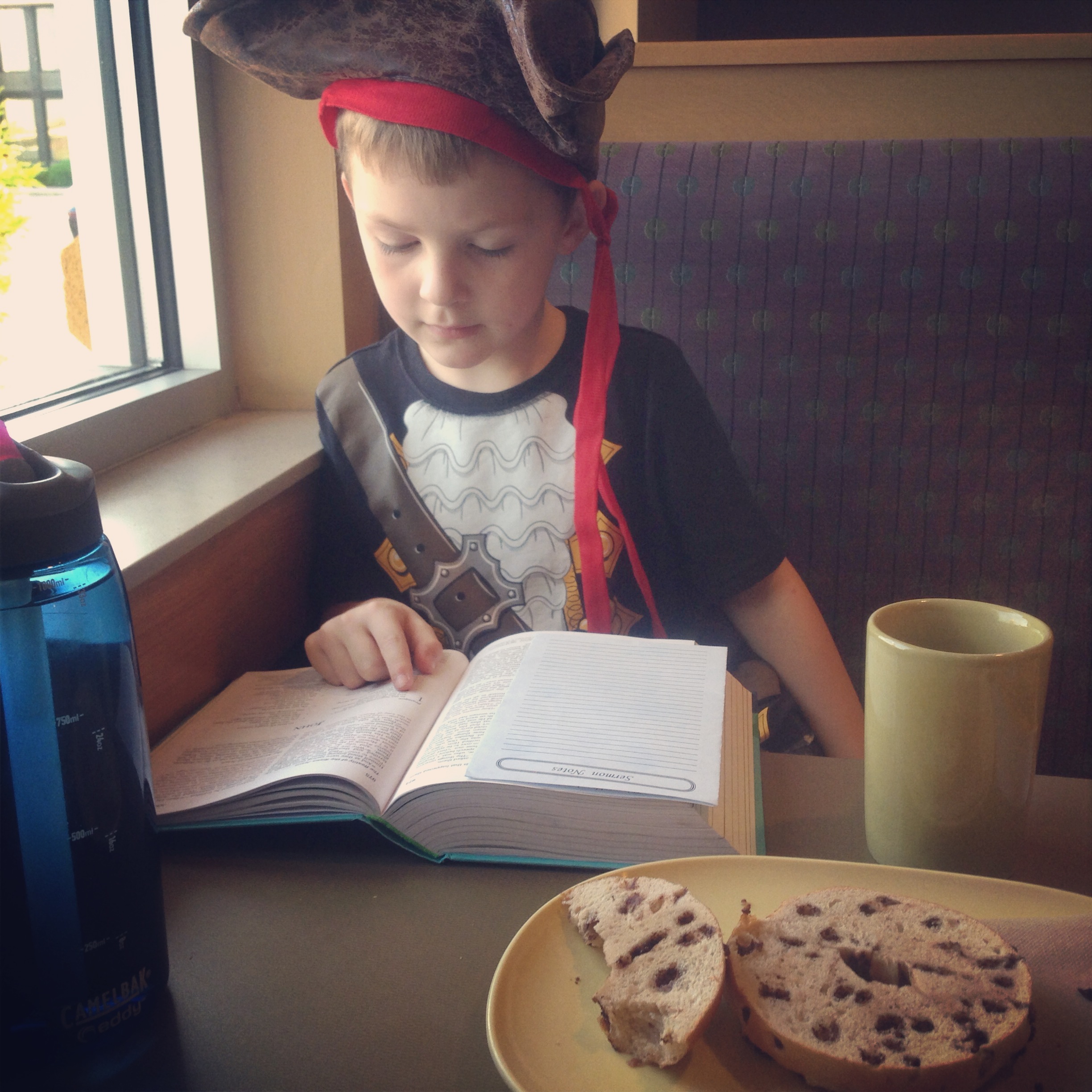 This is my favorite little pirate reading John to me in between sips of coffee (and bites of his chocolate chip bagel).