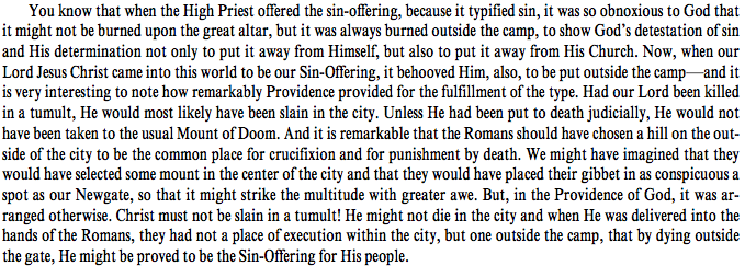 “For the bodies of those animals whose blood is brought into the holy places by the high priest as a sacrifice for sin are burned outside the camp. So Jesus also suffered outside the gate in order to sanctify the people through His own blood.” –Hebrews 13:11-14