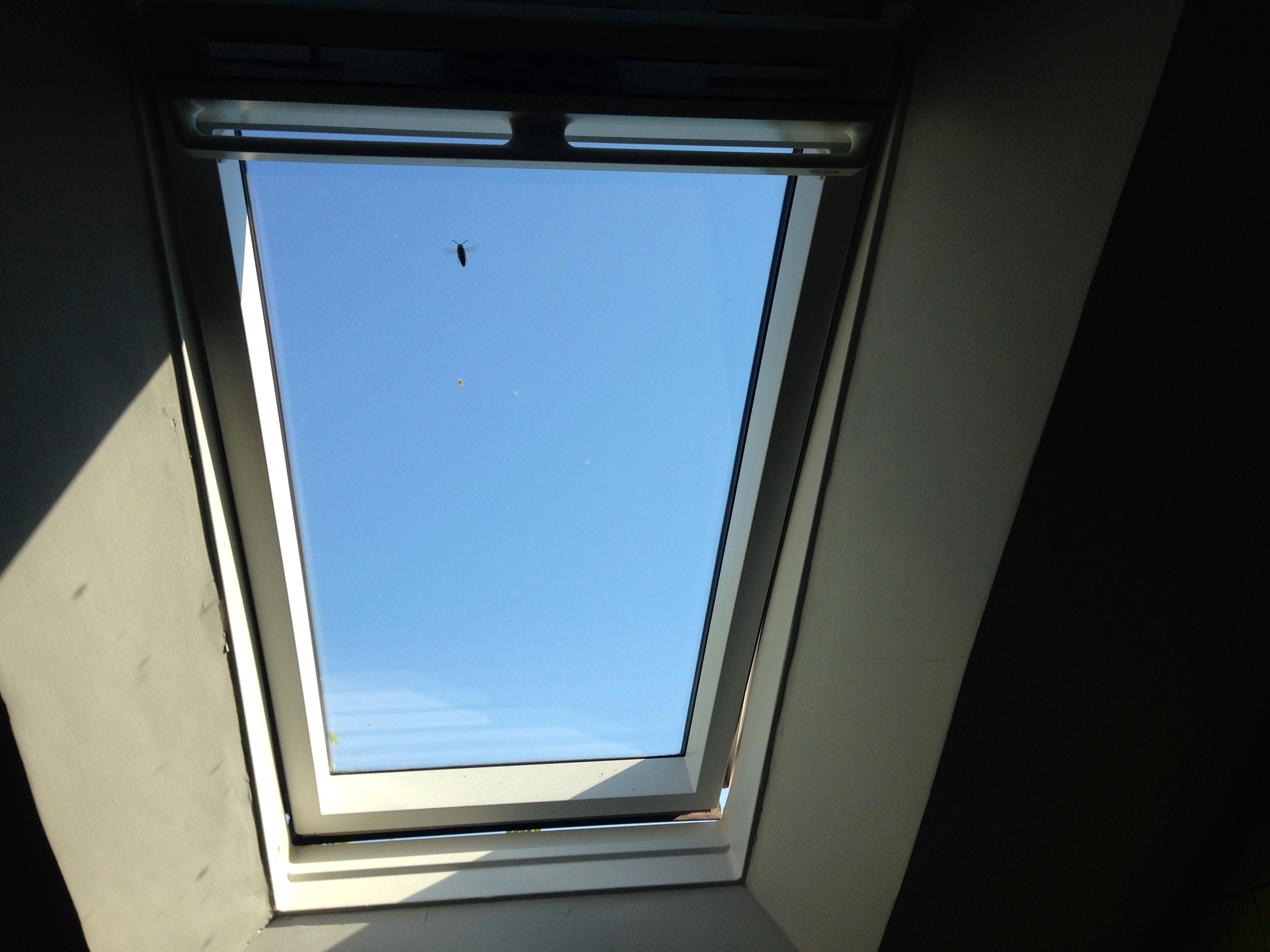 An obnoxiously loud bee had made its way into the bathroom via Florin and Denise’s ceiling window/skylight and was ferociously buzzing around, trying to find its way back outside.