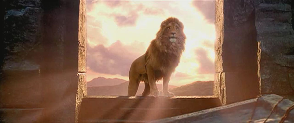 “Yes!” said a great voice from behind their backs. “It is more magic.” They looked round. There, shining in the sunrise, larger than they had seen him before, shaking his mane (for it had apparently grown again) stood Aslan himself.