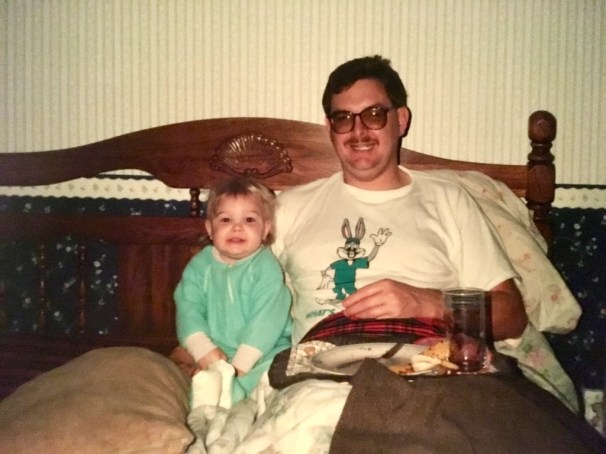 I couldn’t find a photo of our bedtime routine but here’s a gem showcasing my dad’s sweet fashion choices (I mean, it’s a nurse Bugs Bunny asking, “What’s up, doc?”—could it get any better?) and early signs of my love language of food sharing.
